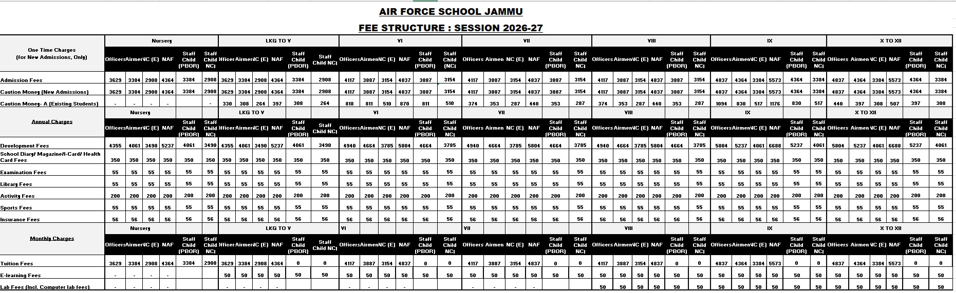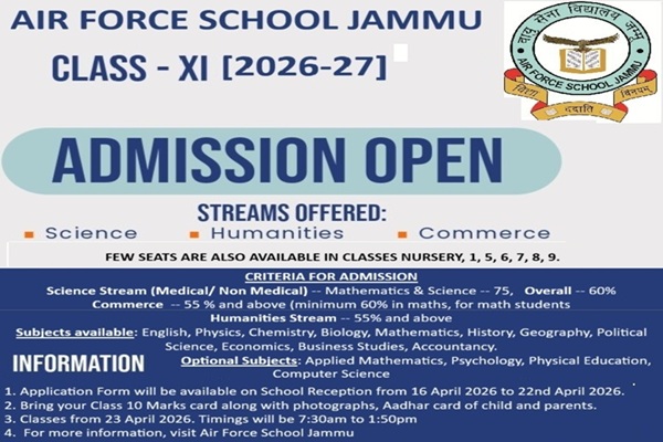 Air Force School Jammu, established in 1970 is being run under the aegis of IAF Educational & Cultural Society and is affiliated to CBSE New Delhi. The School is co-educational, English medium and runs classes from LKG to 10+2 (Science, Commerce and Humanities stream). It has ensured exceptional board results year after year. School has strived to develop and consolidate a quality education system without any rank or gender bias.