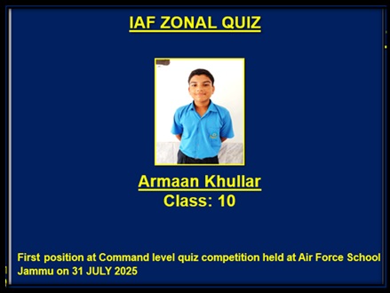 The team won at Zonal level and reached Delhi for the next level. On 9 Aug '23 AFS Jammu team won Second Position in WAC. The team got selected to represent at the next level. In the semi finals on 16 Aug '23, our school team stood First out of 08 teams. On 18 Aug'23, Team AFS Jammu participated in Command Level Final Quiz Competition where WAC bagged Runner Up ( Second ) Position. The competition was tough enough for the participants as the score had minimum margin with the winning and loosing teams. Our team received- A Trophe, 2 books , Certificate and cash prize worth 5000/- each. It was an enlightening and enriching experience for the students.